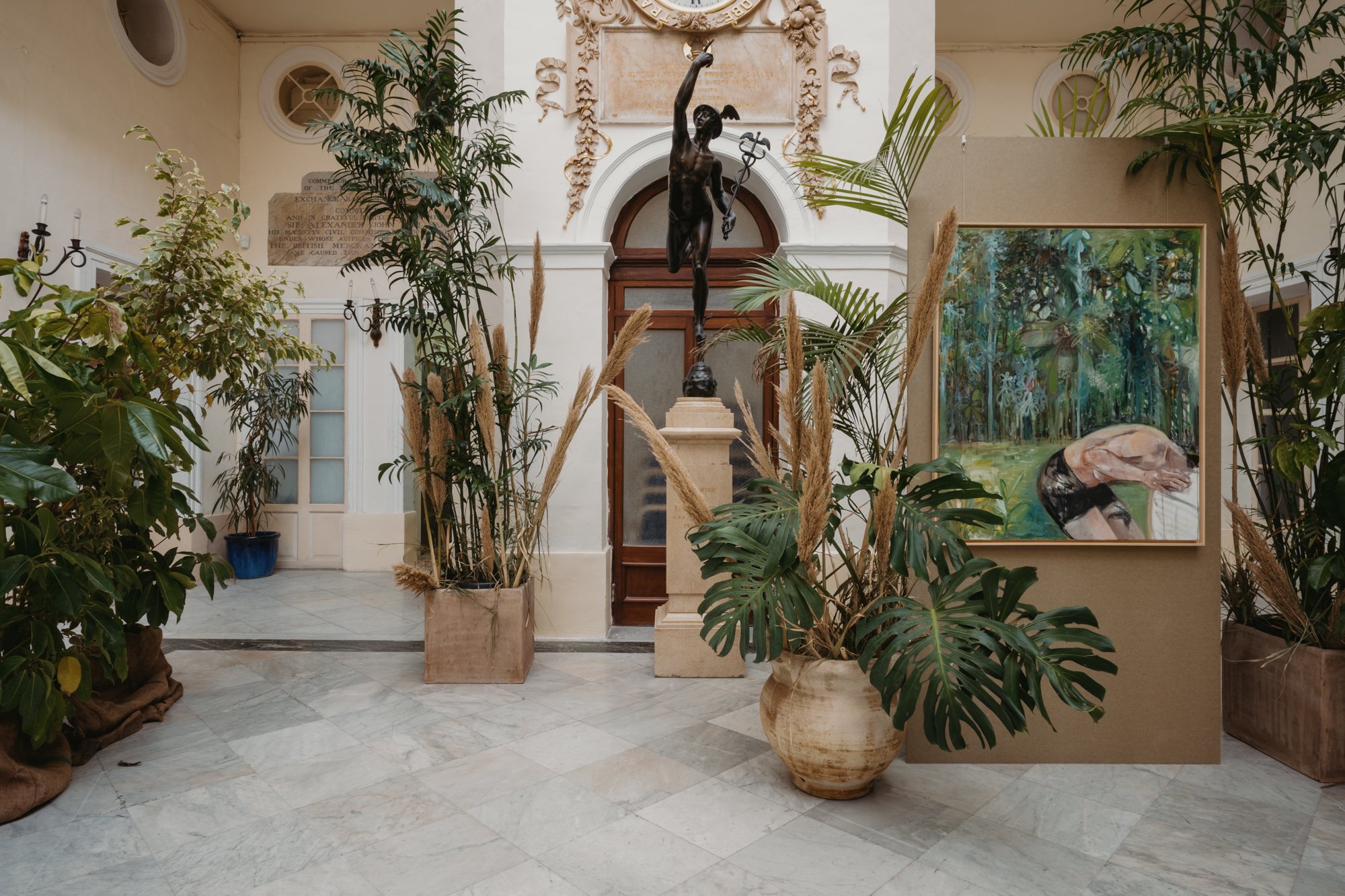 The work of Tina Mifsud is carved around personal narratives installed within specific environments and situations, reflecting on her own investigations. Since 2020, this has included work that studies her body, travels and intimate relationships, shown within disused agricultural and commercial stores, as well as the Malta Chamber of Commerce in Valletta. This method of exhibition-making, conceived during the COVID-19 pandemic, extends the painting process to create a time-specific encounter for audiences.